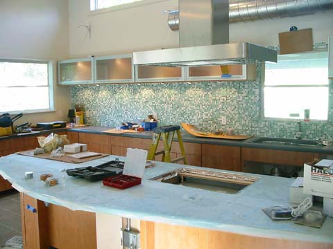 Island gets it's plastic removed. Pendant lights go in.